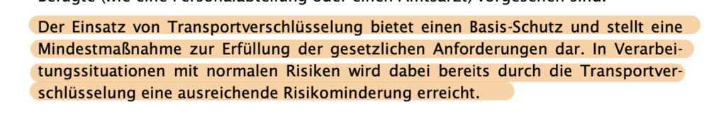 Die Orientierungshilfe der Konferenz der unabhängigen Datenschutzaufsichtsbehörden des Bundes und der Länder vom 27. Mai 2021 unterscheidet zwischen Verpflichtungen bei normalen Risiken und Verpflichtungen bei hohen Risiken. In Abhängigkeit davon kann eine Transportverschlüsselung ausreichender Schutz sein oder aber es ist eine qualifizierte Transportverschlüsselung und gegebenenfalls E2E-Verschlüsselung notwendig.